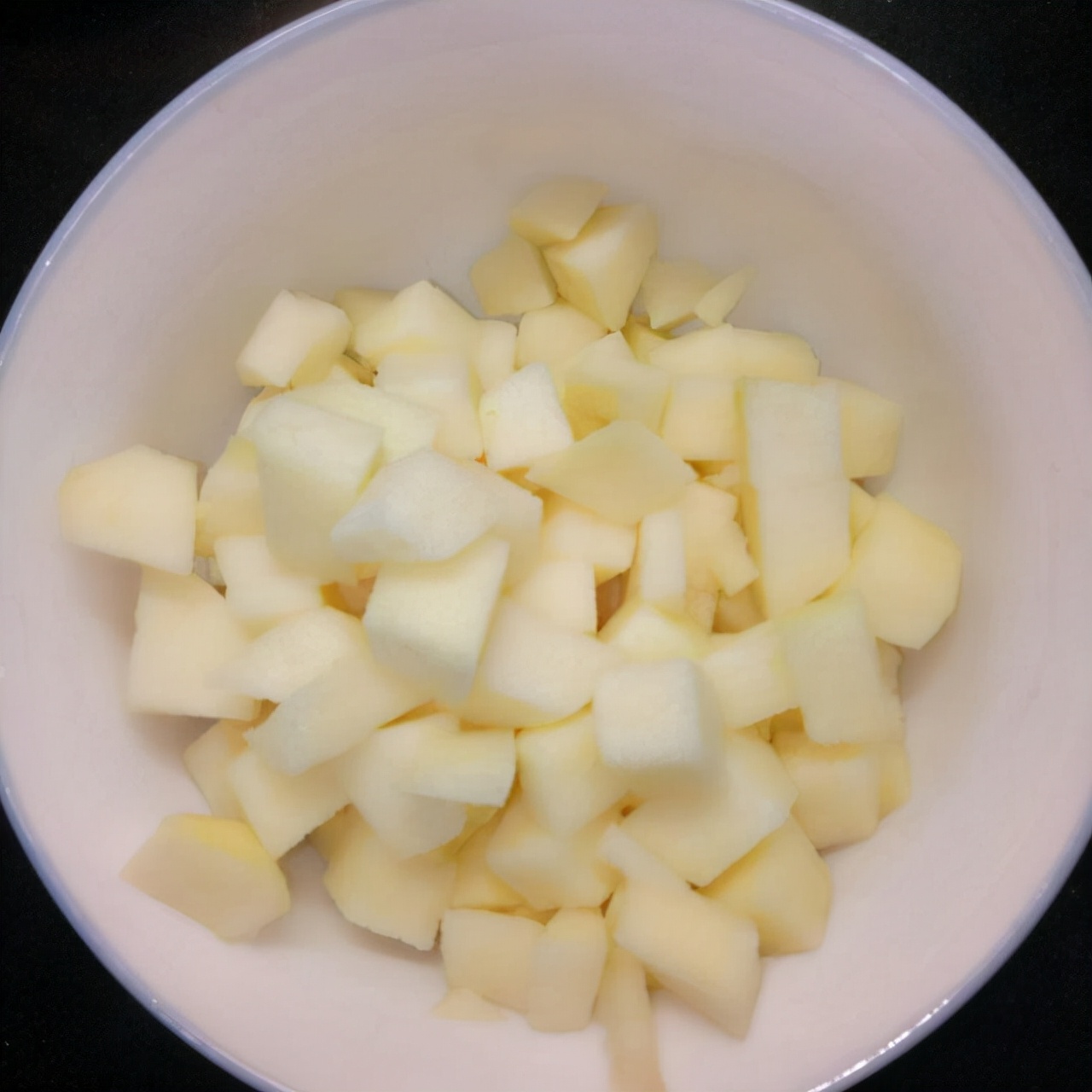 將蘋果切成小丁,放置鍋中小火翻炒,炒至軟爛,將純牛奶倒進鍋裡,文火慢煮,15分鐘後奶香濃郁的減肥下午茶就做好了。