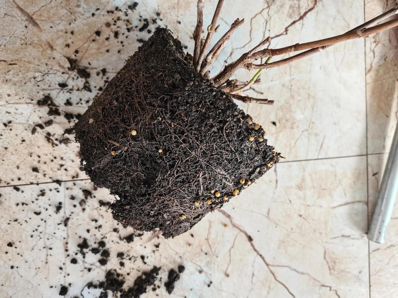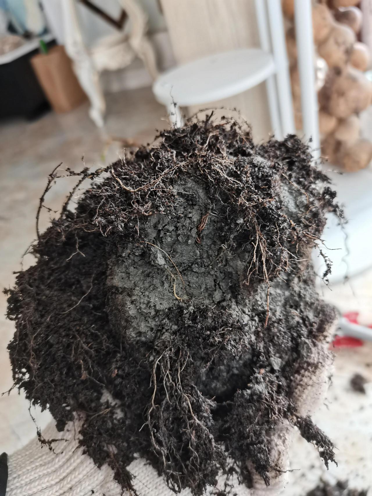 好了,開始換盆!開啟一看,毛細根都變成褐色了,剝掉後發現裡面是不透氣的泥坨子……