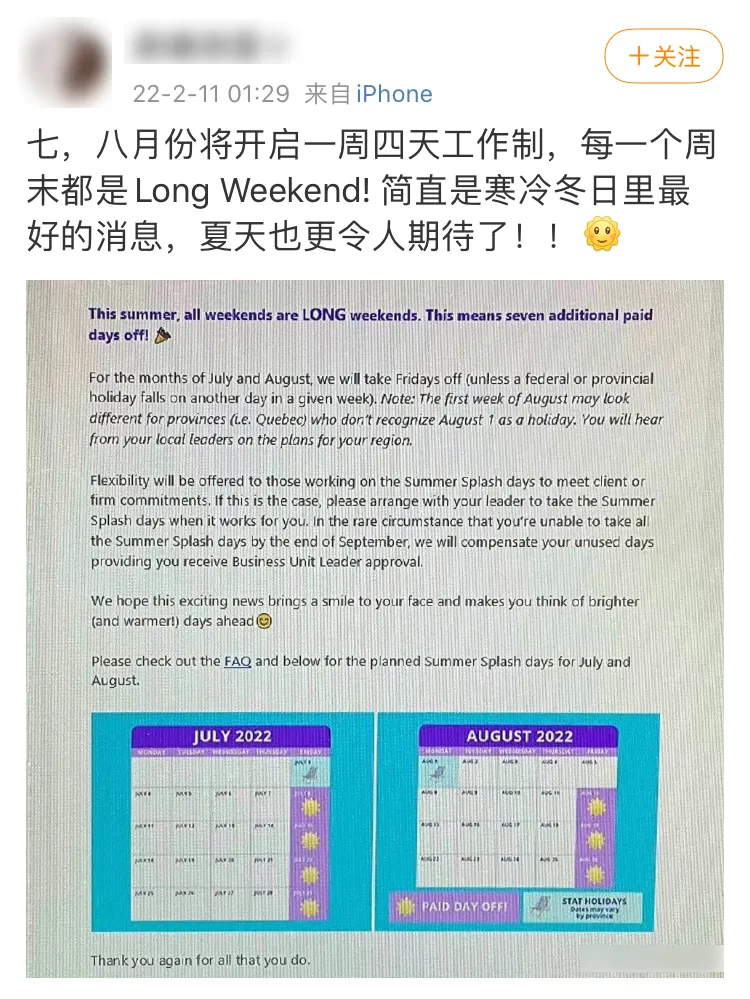 “我在紐西蘭公司也有類似的政策,每天多工作一小時就能休週五。但不是太多人申請因為覺得每天上九小時太累了。”