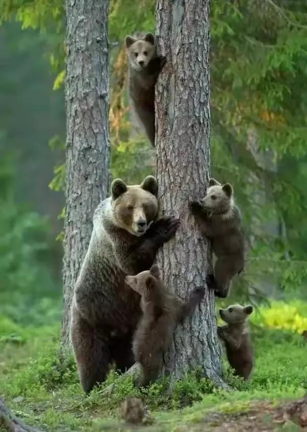 熊媽媽是在教寶寶學習爬樹呢。