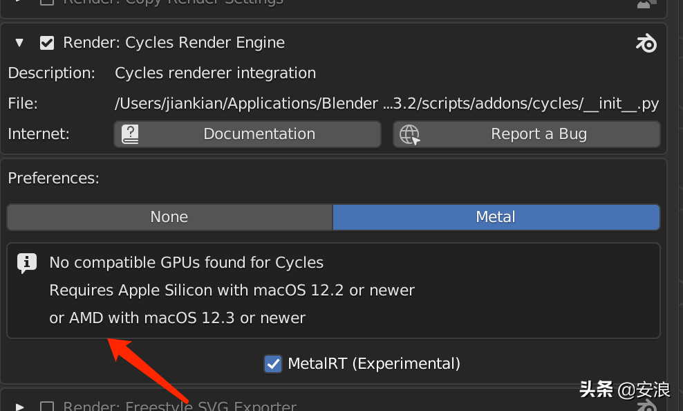 在最新的每日構建版本的Blender3.2版本中,終於可以開啟AMD Metal渲染介面,不過前提是需要升級macOS系統到最新版macOS 12.3以上版本。
