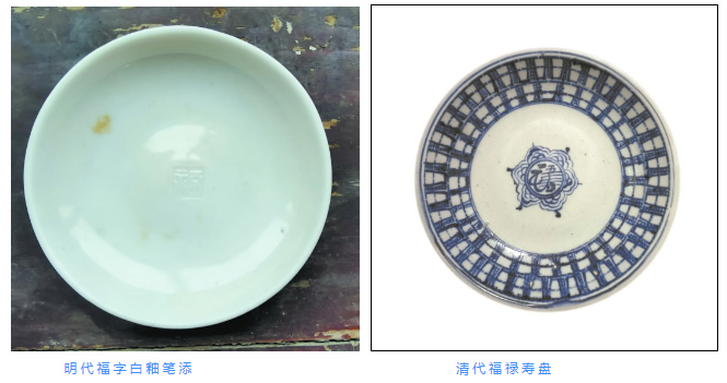 文字歷來是表達資訊最有效最便捷的方法,德化窯裡的“福”文化也不例外。自宋元以來,“福”字在德化陶瓷器物上並不少見。飛雲齋收藏了一塊明代白釉小瓷碟,形制似筆舔,瓷碟正中印有一“福”字。這並非印製在瓷碟的底部,可排除其做為底款的可能,做為器物不可分割的一部分,主要用於表現作品的主題。據瞭解,這樣帶有“福”字的德化窯瓷器早些年古玩市場多有出現,尤其是書寫“福”字的清代及民國的青花瓷存量很大。再者,德化陶瓷龜印通常用於製作壽辰的米粿,既是龜崇拜的印證,也是德化窯“福”文化的重要體現。它通常在一個龜形圖案的橢圓模具中間反字陰刻“福”“福祿壽”“喜”“財”等字,紋樣豐富,家喻戶曉。閩南德化窯龜印年代可追溯到明代,多加釉料以中低溫燒製而成,釉色以白釉和醬釉為主,到現仍在生產使用,只是樣式反而比舊時更加簡單,多數龜印只刻一個“壽”字。