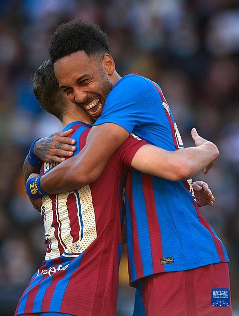 2月20日,巴塞羅那隊球員奧巴梅楊(右)與隊友加維在比賽中慶祝進球。