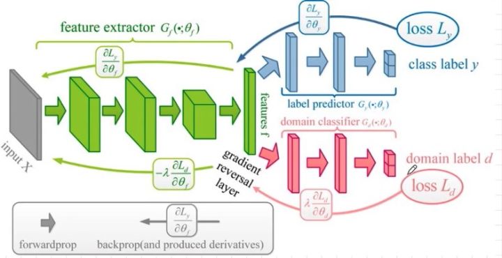 想要提取到不變特徵,其實可以借鑑 GAN 的思想,給網路加“對抗”,訓練域分類器,對 feature 進行域分類,其實就是二分類,分出 feature 屬於晴天還是霧天,並不斷提高辨別能力。同時,綠色部分形成對抗,不斷提取的特徵讓後面的域分類器無法區分出晴天和霧天。這樣,經過幾輪的迭代,綠色部分所提取的特徵就越來越接近不變特徵。