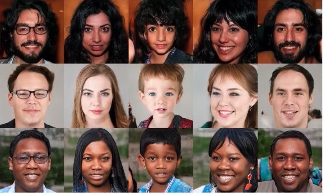 這裡會有一個問題。如果直接把真實的圖 copy 一份,一模一樣,那麼鑑寶專家就分辨不出來了。所以說這裡邊要增加一個 Random 模組,所以說一開始必須要有 Random noise,就是隨機的擾動,不允許 Generator 產生的圖片和真實圖片一模一樣。在不允許一模一樣的情況下,還必須和真實圖片很接近,這才學到了這個真正的精髓。比如下圖中這些人都不是真實世界中存在的,而是 GAN 生成的。