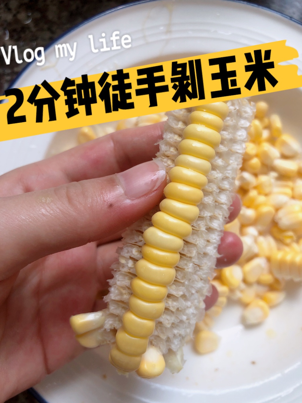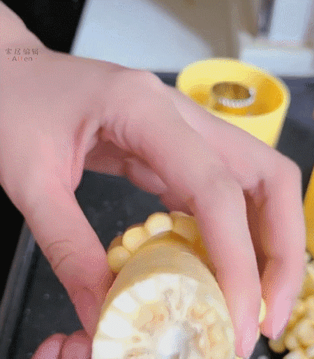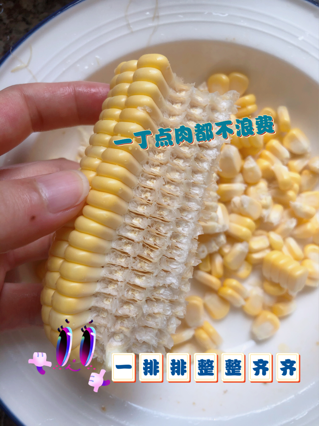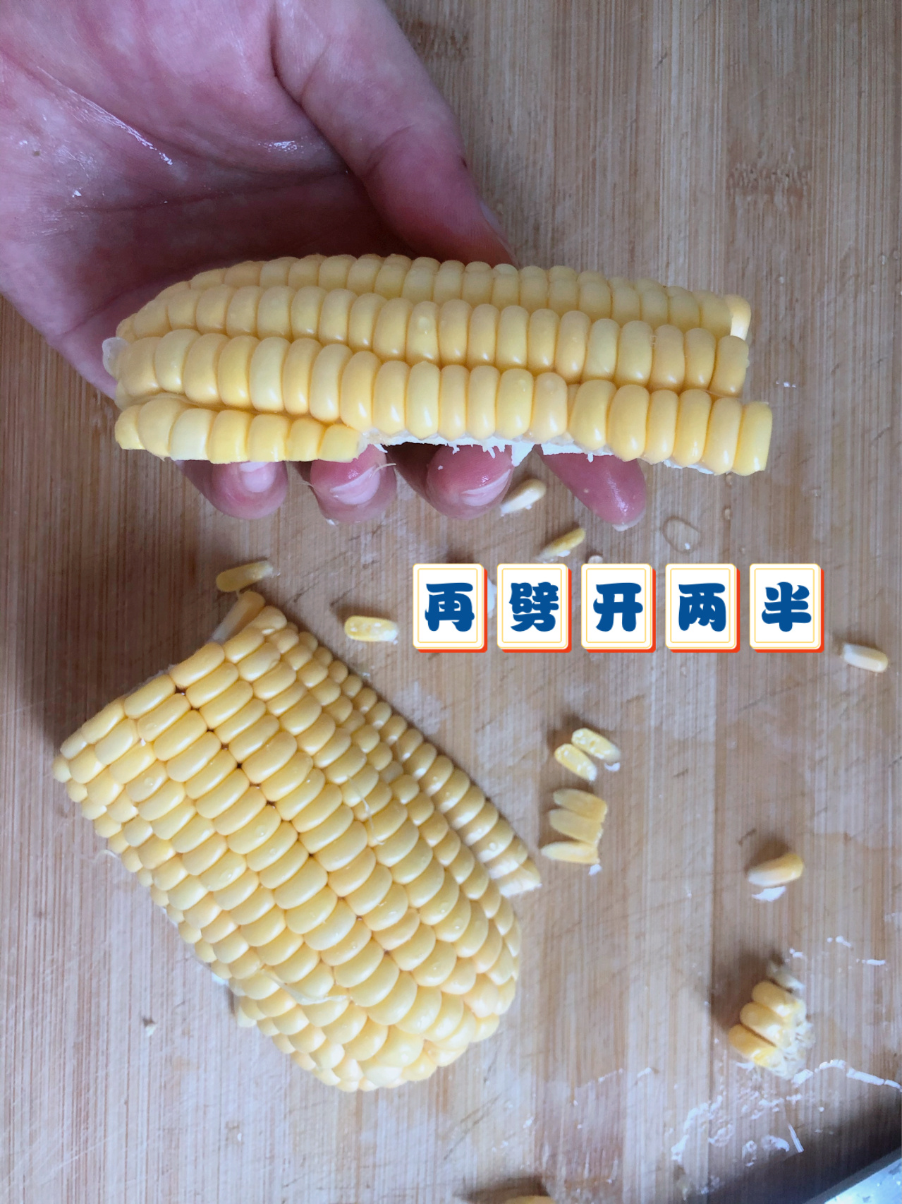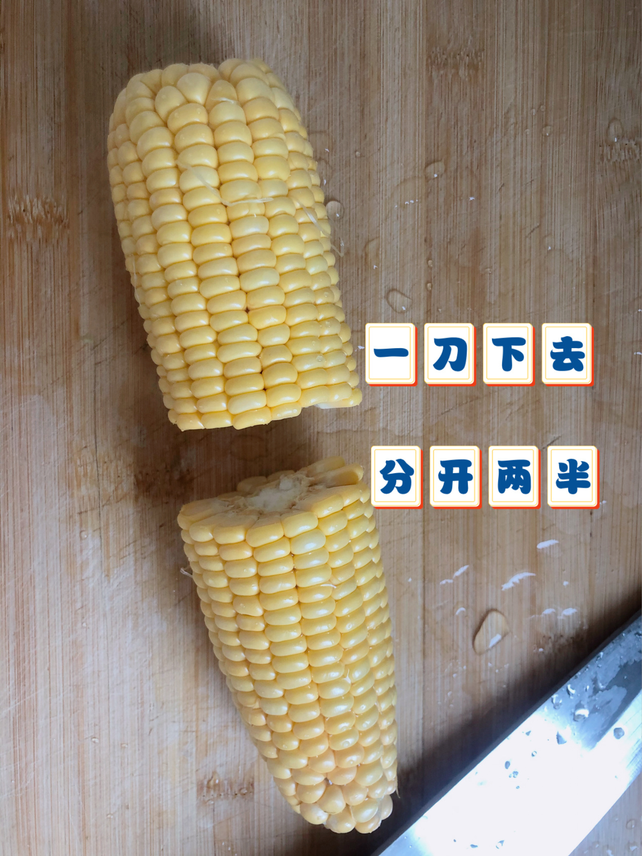 切到這個程度直接用手往下剝,輕輕鬆鬆就能剝掉飽滿的玉米粒,不需要藉助任何工具,乾淨衛生還不浪費。
