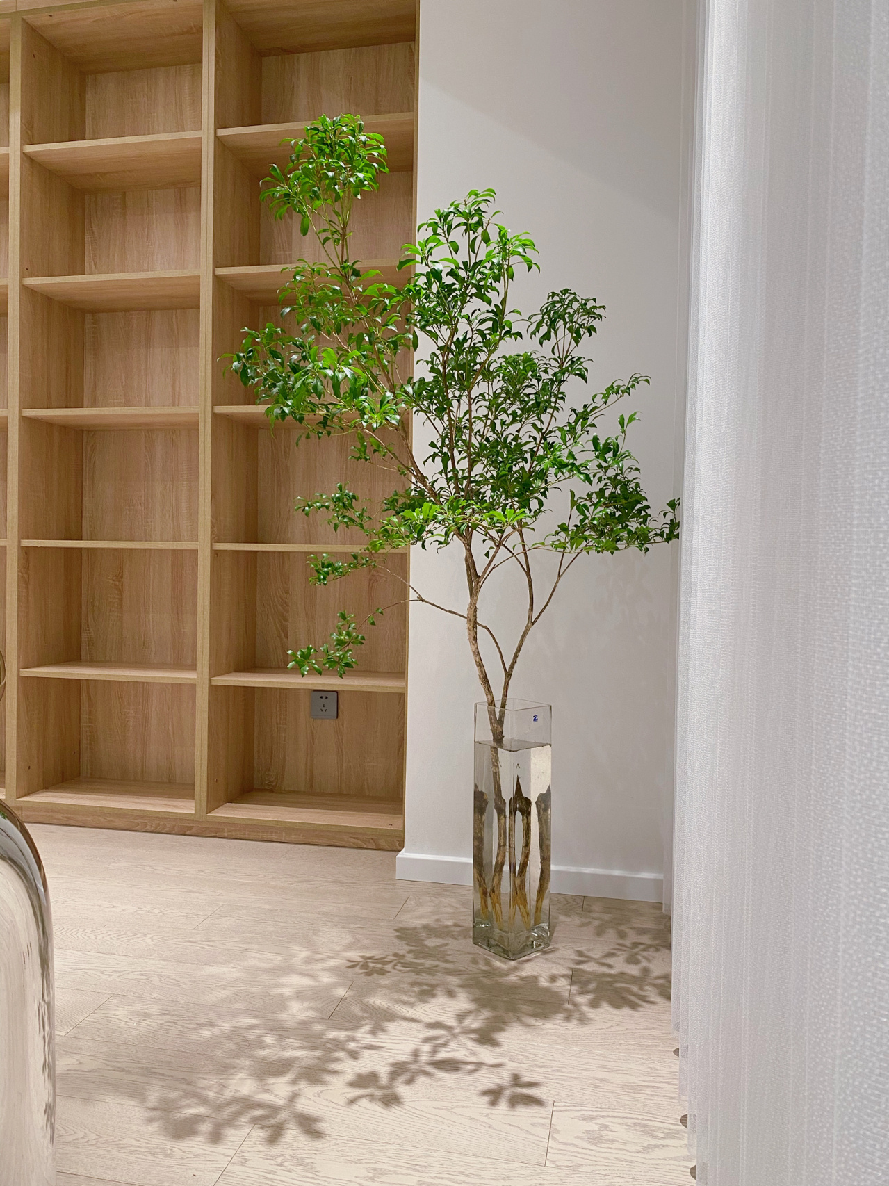 因為買回來的是樹枝,必須要插在水中吸收水分,除此每天還要用噴壺精心給葉片噴水,為了保證存活還要經常給樹枝底部泡水的部分刮死皮、修剪枯葉。