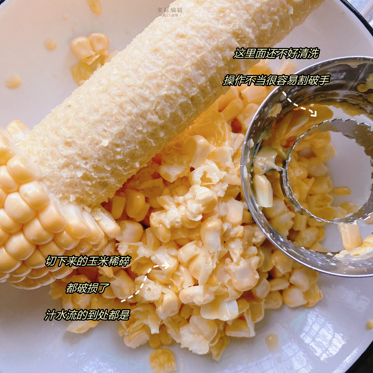 首先它的切口是固定大小的,而玉米本身就是粗細不均的,多數情況下都很浪費玉米,玉米粒是掉下來了,但還殘留了起碼五分之二的部分沒剝下來,非常的浪費玉米。