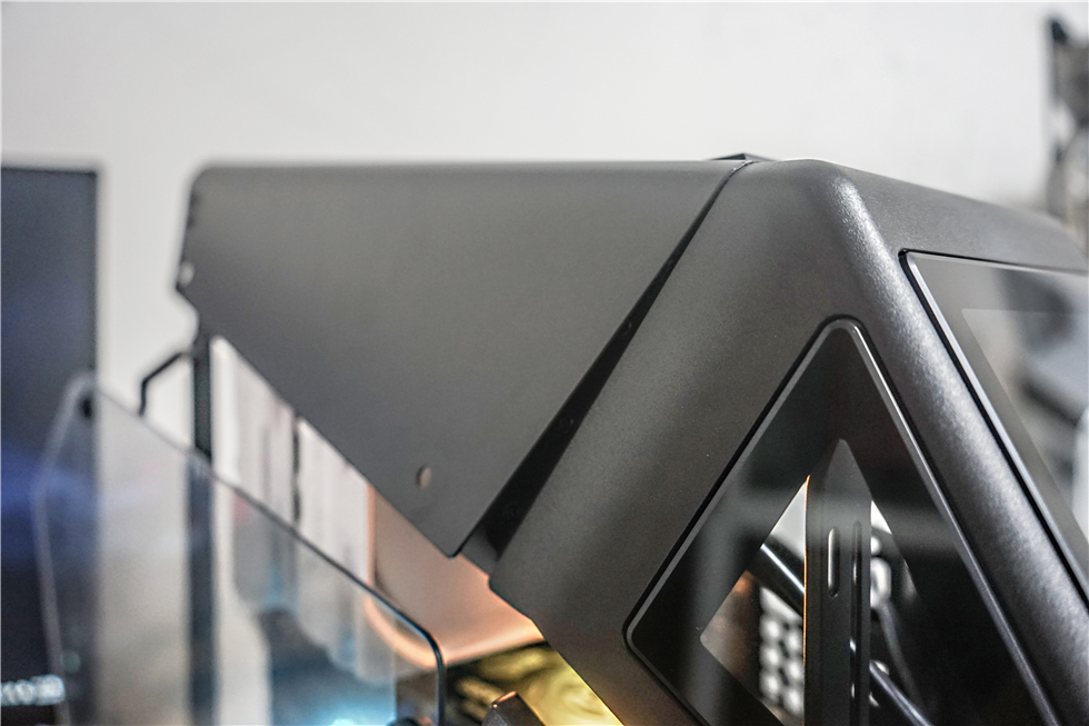 阿帕奇MINI機箱屬於開放式架構的異形機箱,採用了大面積折板處理的裝甲一般的金屬外殼,既有稜角又不特別突出,而且表面的噴漆處理風格非常硬核,再加上覆蓋著3面玻璃的,仿若直升機座艙式設計的頂部,武器一般的工業美感有了!