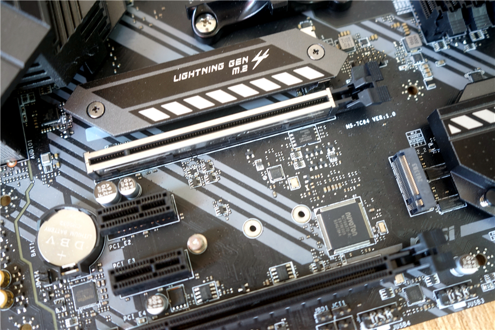 兩個M.2介面,上面覆蓋有散熱裝甲的支援PCIe 4.0 x 4,可上PCIe4.0 SSD,在其下方,覆蓋著合金裝甲的PCIe x16插槽支援PCIe 4.0 x16,下方的PCIe x16插槽和第二個M.2插槽共享頻寬,只支援PCIe 3.0 x4,且不能同用。
