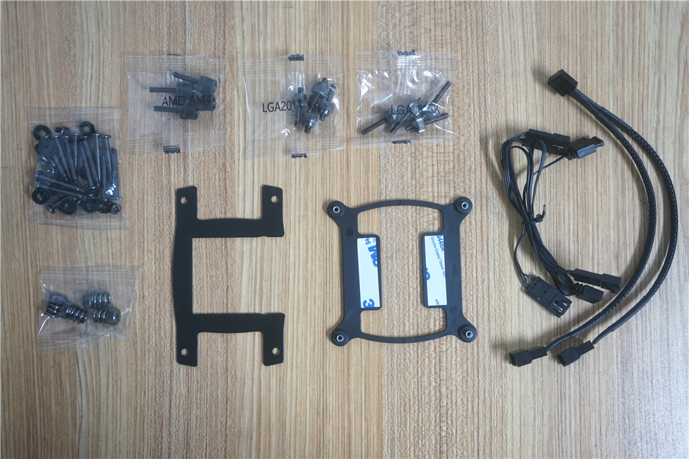 配件包開啟來一張,兩種扣具和對應的螺絲等安裝配件,1分2風扇轉接線和海盜船專用1分2燈效線。