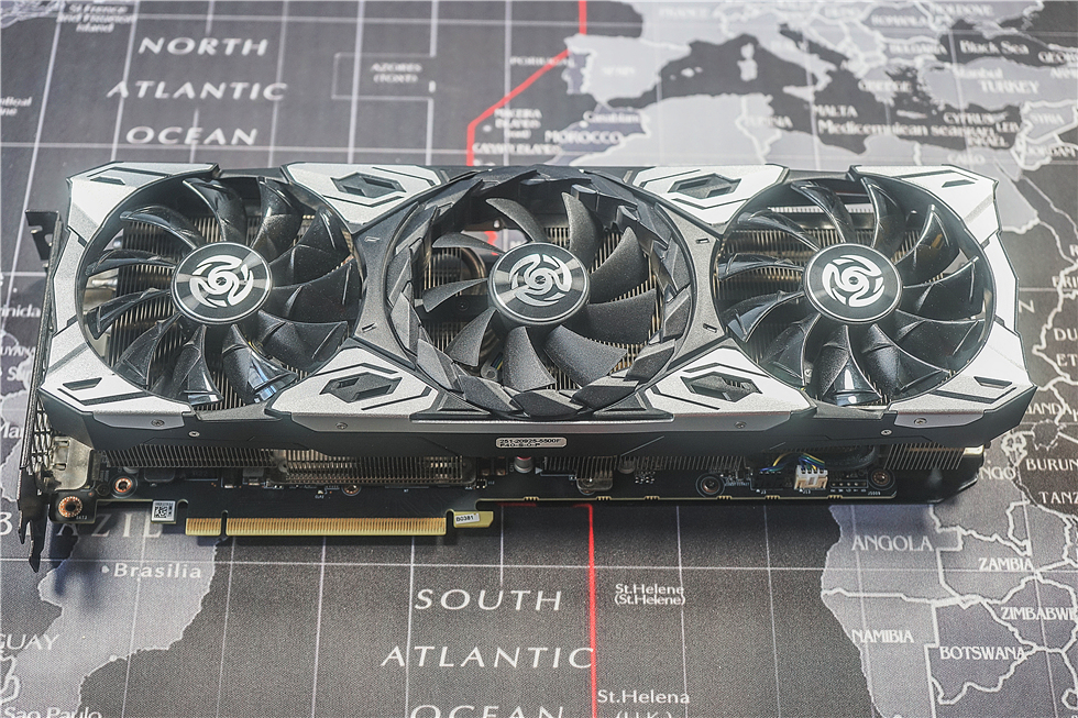 顯示卡肩部中心是索泰的logo信仰燈,常規的雙8pin供電。