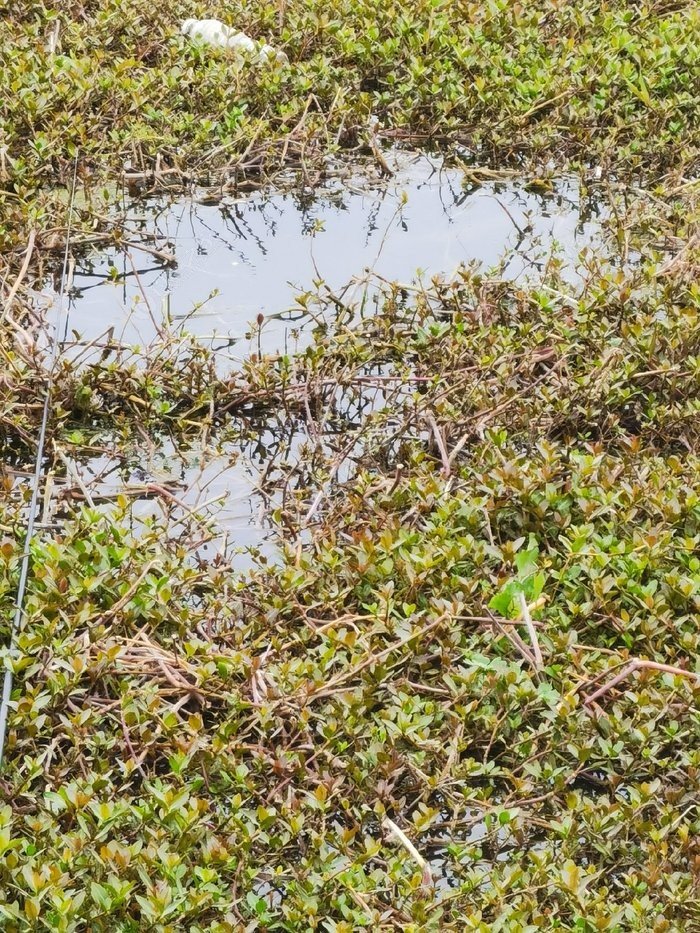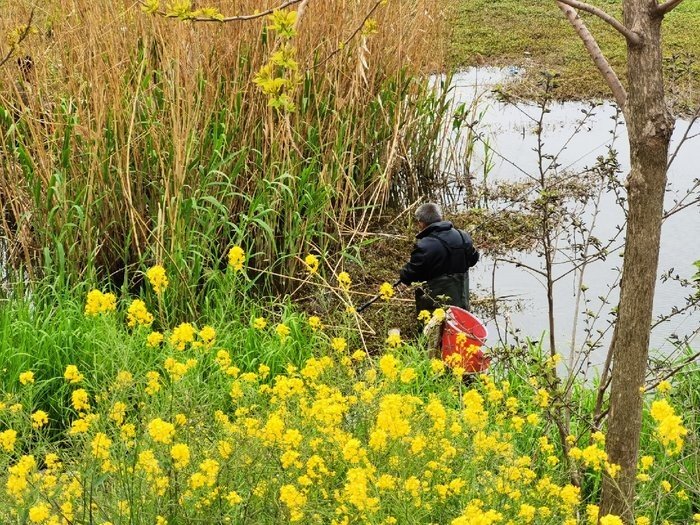 由於今天走的太遲,直接導致原來的老釣位已被別人佔領,只能步行先向西偵察,一路停滿了釣魚人的汽車,人挨人,人擠人,大概有50餘人在垂釣,走了200米,一個空位沒有,又折向東走了約300米,位置倒有,都不太理想,只能隨便找個地方打窩,我打了三個草窩,用7.2米竿垂釣,就像扔進大水缸一樣,紋絲不動,一口沒有。