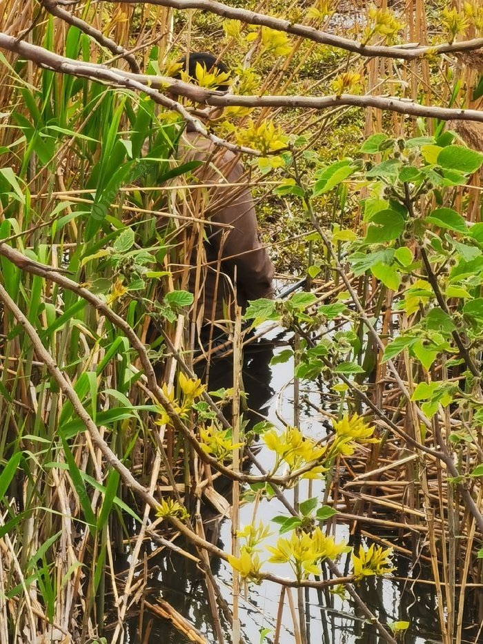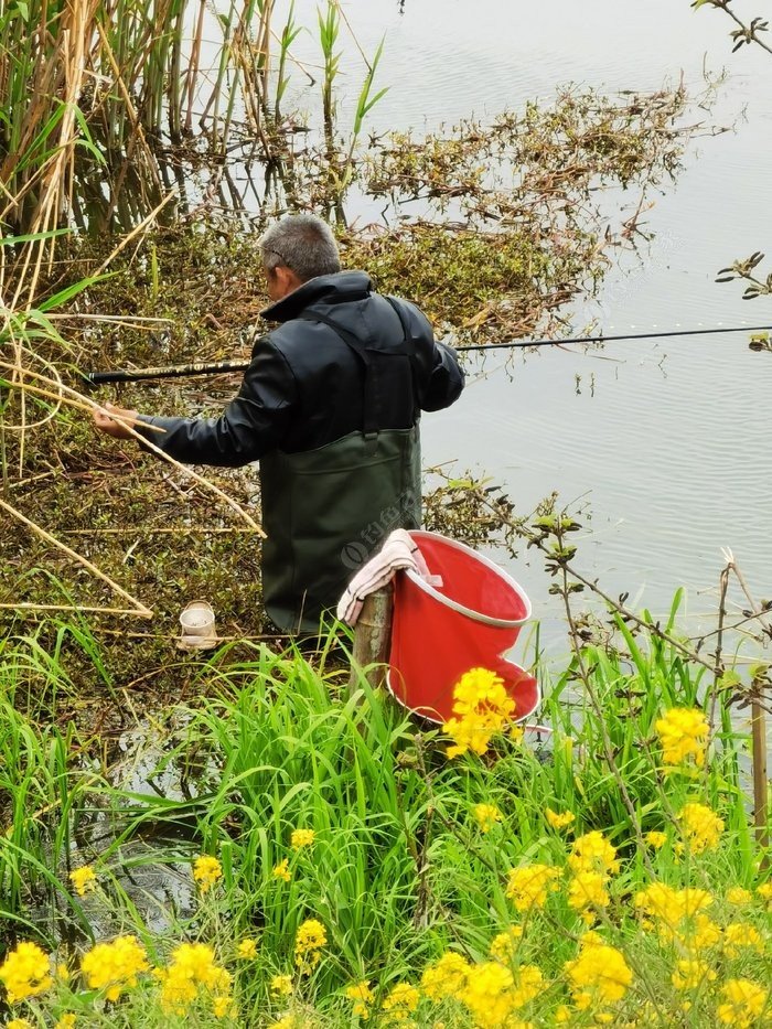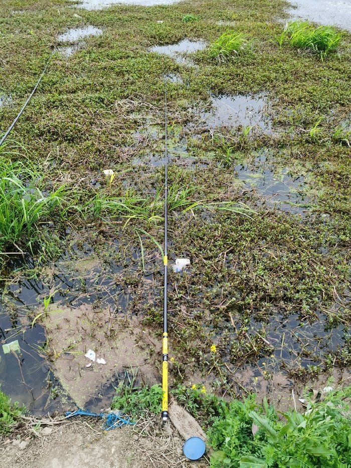 由於不好釣,沒口,大家都在神轉,東撞撞西轉轉,看看其他釣友釣的怎麼樣,就看見2個老釣友穿皮叉站齊腰深水大柴地裡垂釣,雙手抱根10幾米的大炮,看的都累。