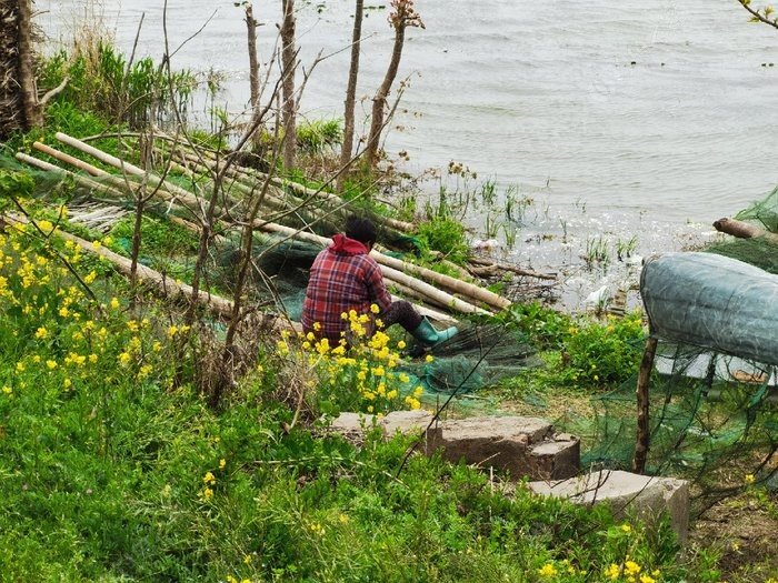 湖中大船下下來個小船,一大娘劃小船到岸邊小棚子邊坐下開始修捕地籠,地籠有2,30米長,大概10餘個地籠,補好後拉成長條狀擺那晾曬,白馬湖十年禁補,不知道她修捕地籠是幾個意思?難不成夜裡偷捕?否則要地籠何用?不懂。