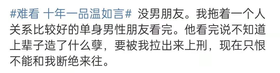 情人節檔三部電影之中,被噴得最狠的是《十年一品溫如言》無疑了。因為有許多原著書粉的關注,在看到如此扶不上牆的影視化作品時更是氣不打一處來,有關“難看”的話題已經直衝熱搜,足以表達觀眾們的憤怒。