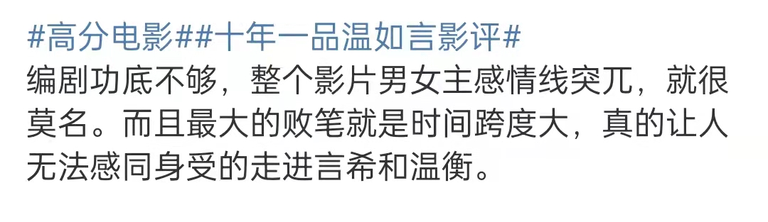 《十年一品溫如言》能吐槽的點是一抓一大把,首先在劇情設計上就十分拉垮。原小說描寫了一段跨越十年的戀愛,這對於一部只有100多分鐘的影片來說本身就是一個不小的困難,而編劇也的確“不負眾望”,將男女主的感情線處理極為突兀,讓人根本無法感同身受。