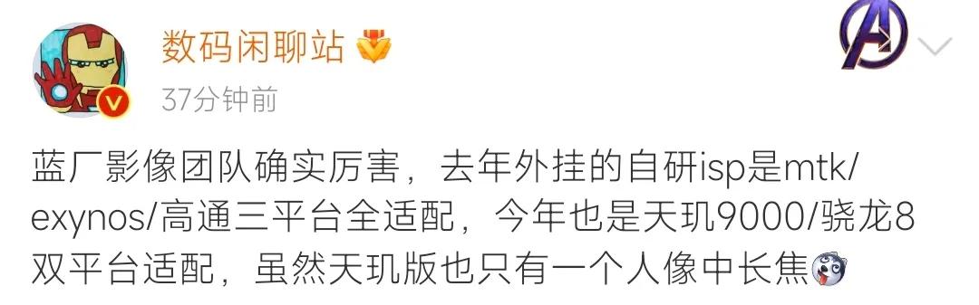 數碼博主數碼閒聊站稱,藍廠影像團隊確實厲害,去年外掛的自研ISP是mtk/Exynos/高通三平臺全適配。今年也是天璣900/驍龍8雙平臺適配,雖然天璣版本也只有一個人像中長焦。藍廠的拍照方面能力很強,x系列更是定位在了高階影像旗艦。