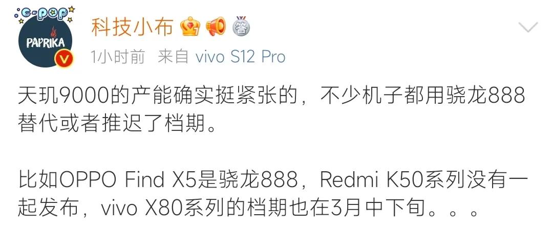 博主科技小布稱,目前天璣9000的產能很緊張,不少機子都有驍龍888替代或者推遲檔期。就比如OPPO FindX5系列,原定Pro版是搭載天璣9000,但目前OPPO不知道怎麼命名改機。還有Redmi50系列也沒有一起釋出,vivox80系列也因檔期的原因定在了三月中下旬。