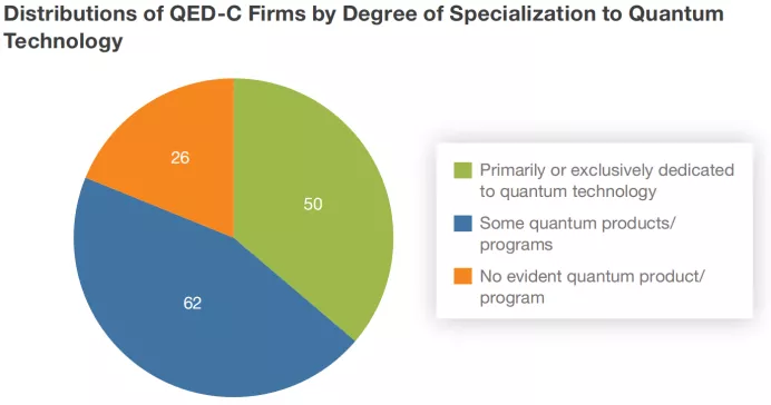下圖顯示了QED-C公司量子技術專業化程度的分佈。第一類公司是致力於量子技術的初創公司。第二類公司並不專注於量子技術,但他們生產與量子技術相關的商業產品,或報告了一個專門的內部量子研發專案。至於第三類公司,沒有專門的產品或研究專案。這類公司中的大多數都在關注該領域的發展,尋找潛在的有用應用。他們自己並沒有積極推動這一領域的發展。但也有可能他們正在資助沒有公開宣佈的內部研究。