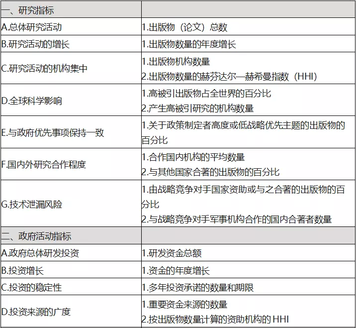 報告指標分為四類,科學研究指標、政府活動指標、私營行業指標、技術指標。