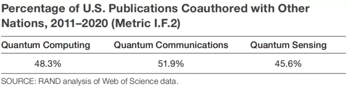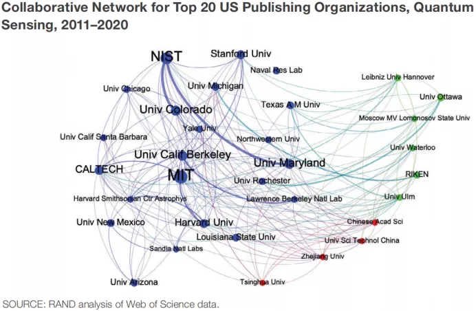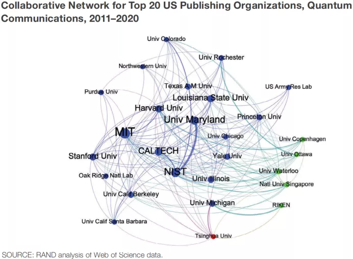 上述研究單位以大學為主。此外,橡樹嶺國家實驗室位列美國前20名研究單位之列。NIST在QIS出版中的作用值得強調;NIST的兩個辦公室(馬里蘭州蓋瑟斯堡和科羅拉多州博爾德)在三個QIS應用領域發揮著重要作用。