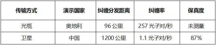 下表顯示了幾個指標中糾纏光子產生的技術現狀以及演示國家。產生糾纏光子對有兩種主要方法:目前大多數工作系統使用一種成熟的過程,稱為自發參量下轉換。此外,一種將電場應用於砷化鎵量子點的方法似乎很有希望,但尚未實現可擴充套件性。德國在這兩類糾纏源方面都處於或接近全球前沿。