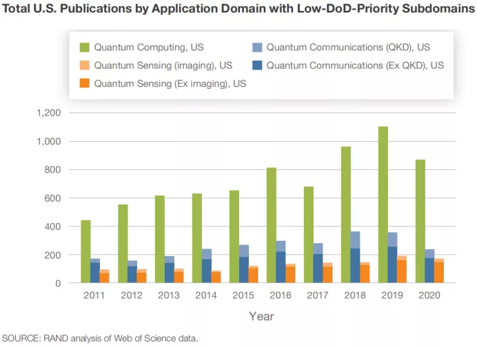 在QIS出版物中篩選出SME認為與這些低優先順序領域相對應的關鍵詞。在2010-2020年的分析期間,27.6%的美國量子通訊出版物集中於QKD或量子密碼。同一時期,16.1%的量子感測出版物以量子成像為主題。圖2描述了美國在三個主要應用領域的總出版物,並區分了國防部低優先順序的子領域(淺藍色和淺橙色陰影)。