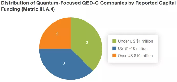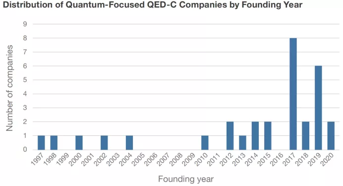 圖9顯示了32家專注於量子的QED-C公司的成立年份分佈。這些公司中有很多都成立時間較短,其中大多數是2017年成立的。這一快速增長表明私營部門對量子技術產生了濃厚的興趣,但許多初創企業還沒有穩定的商業模式、產品或收入,而且它們在財務方面可能容易受到量子技術行業低迷的影響。