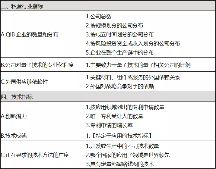 本報告的指標具有不同的自然範圍。一些指標試圖描述一個給定應用領域的國家產業的整體狀態,因此被應用到國家量子產業的總體。其他指標則更為細緻,試圖捕捉國家在個別技術方面的前沿能力,因此必然具有更精細的範圍。根據決策者的精確目標,不同的指標對不同的目的或多或少會有用。