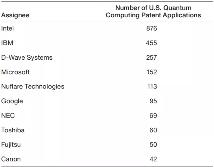 美國專利申請量在2000-2010年以每年100件左右的線性增長之後,累積的美國專利申請量開始呈指數增長。超導量子計算領域累積專利申請呈現S曲線,它幾乎佔美國量子計算專利申請總數的三分之一,並且似乎比圖量子計算增長得更快。