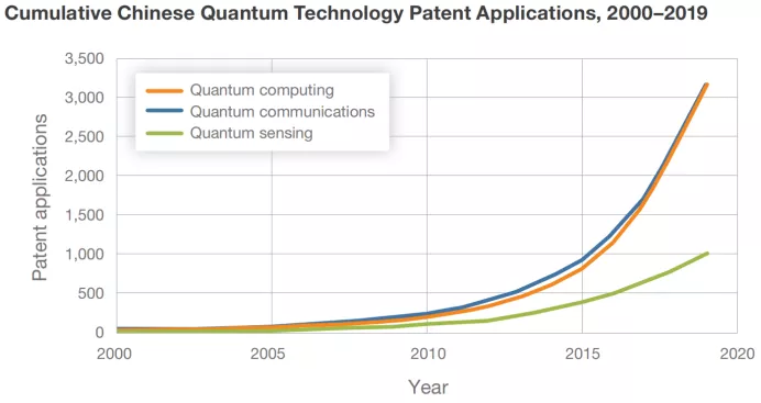 中國在量子計算和通訊領域的專利申請趨勢非常相似。在經歷了一段大致呈線性增長的時期之後,中國在這兩個應用領域的累計專利申請在2009年前後開始呈指數增長。而從2009年開始,量子感測領域出現了S曲線,從那一年的約40件專利增長到2019年的650多件。