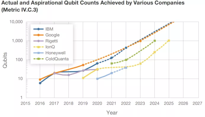 目前,美國兩大領先的量子計算開發商是谷歌和IBM。他們開發了具有53-65個量子位元的系統(報告成文時,IBM還未釋出127位元量子晶片),並發表了描述其分析和基準測試結果的論文。