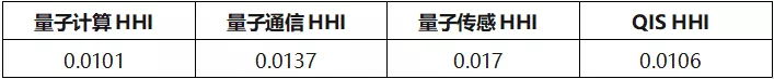 研究單位的赫芬達爾—赫希曼指數(Herfindahl-Hirschman Index, HHI)衡量了一個國家的研究單位出版產出的集中程度,下表描述了三個主要應用領域以及QIS的HHI。
