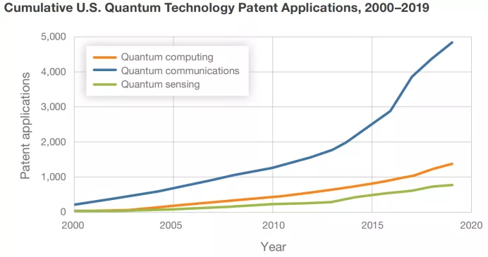 報告評估了量子計算、量子通訊和量子感測的指標,計算了每個部門的所有美國專利申請,包括量子出版物分析中使用的任何關鍵詞。總的來說,三個領域都顯示出巨大的創新潛力。