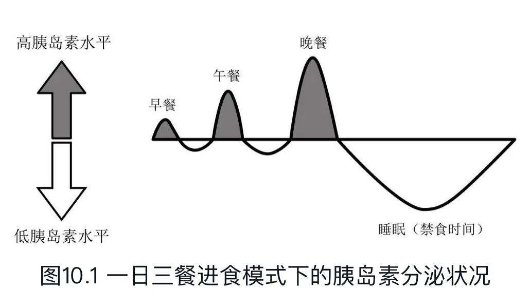如圖所示,在胰島素的脈衝波動(進食時間)之後,伴隨著長時間的禁食時間。