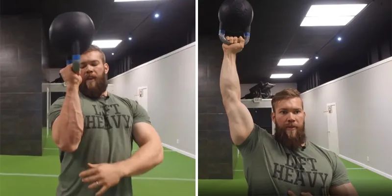 伸肩伸肘將壺鈴向上推起,隨後肩部外旋掌心朝前,鎖定後再慢慢回到起始位置。
