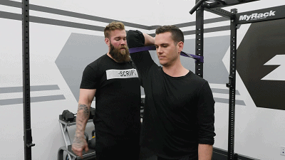 雙手向上向外拉伸彈力帶,同時完全伸展肘關節與肩關節,隨後慢慢回到起始位置,3組6-10次