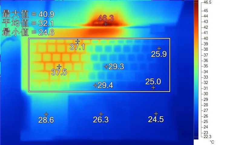 表面溫度如上圖所示,鍵盤鍵帽最高37.5℃出現在WSAD鍵區域,功能鍵為37.1℃,方向鍵25℃。左腕託溫度為28.6℃,背面中心點28.9℃。