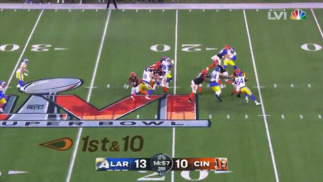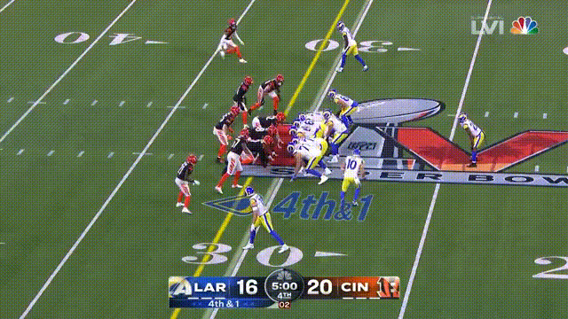 最後,猛虎的關鍵4檔還是輸在了口袋保護上。公羊的明星防守鋒線阿隆-唐納德對伯羅施壓,並完成致勝一擊造成傳球失誤。公羊在主場以23-20的比分捧起了第56屆超級碗,主帥肖恩-麥克維也成為了歷史上最年輕的超級碗總冠軍教練!