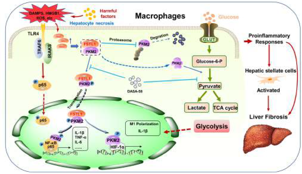 FSTL1 被廣泛認為是肝臟內外的纖維化促進蛋白,但以前的研究主要集中在 FSTL1 在成纖維細胞等間充質細胞中的促纖維化功能,而不是在巨噬細胞等炎症細胞中的促纖維化功能。丙酮酸激酶 M2 (PKM2) 直接參與與癌症和炎症反應相關的代謝重程式設計(有氧糖酵解)。重要的是,PKM2 已被證明可以控制炎症中的巨噬細胞代謝重塑。PKM2 與缺氧誘導因子 1α (HIF-1α) 相互作用,並激活巨噬細胞有氧糖酵解所必需的酶的 HIF-1α 依賴性轉錄。