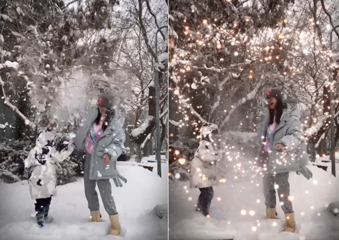 在影片中,經緯帶著兒子站在雪地之中,厚厚的積雪已經使得大地看起來一片蒼茫,潔白無瑕。經緯身穿一件羽絨服和雪地靴,戴著黑框眼鏡,看起來很是可愛鄰家。而其兒子也穿著嚴實,身高已經超過了經緯的腰部,一路小跑著朝母親奔去。經緯用力搖晃著樹枝使得積雪落下,兒子雙手接住分外開心,母子玩耍畫面溫馨。