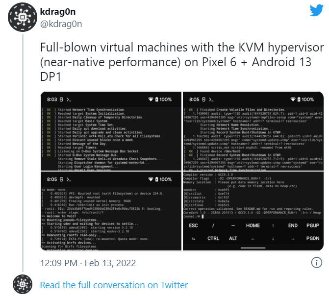IT之家 2 月 14 日訊息,微軟在 Win11 中推出了安卓子系統 WSA,基於 Hyper-V 虛擬化平臺,這個大家都不陌生。而谷歌在 Chrome OS 中也採用了類似的技術執行 Linux 程式,名為 Linux 核心虛擬機器 KVM。Android 系統也是基於 Linux 核心構建的,因此在 Android 中使用 KVM 執行其他作業系統在理論上也是可行的。