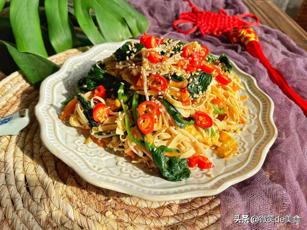 所需食材:菠菜 1把、金針菇 1把、雞蛋 1個、豆腐皮 1張、胡蘿蔔 1段、大蒜 2瓣、小米椒 1個、熟白芝麻 適量、鹽 1小勺、一品鮮醬油 1勺、蠔油 1勺、香醋 2勺
