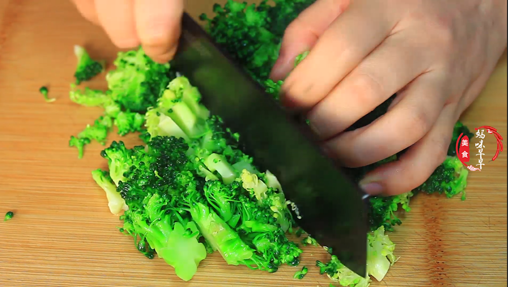 2,鍋裡水開後,滴入一些油,這樣焯出的西藍花特別翠綠,時間不需要太長,水開後就可以控水撈出來了,等西藍花稍微涼一些了,咱們把它切碎,儘量剁得細碎一些,這樣後面比較好操作。