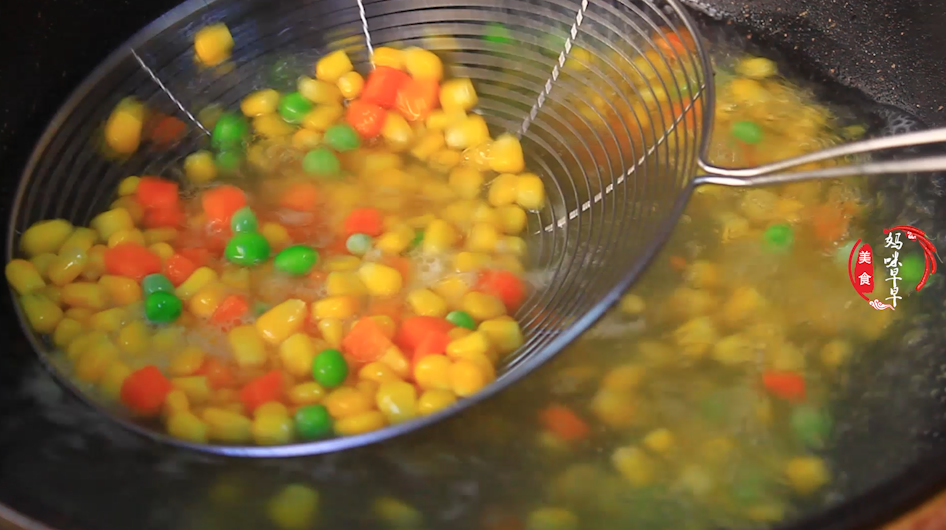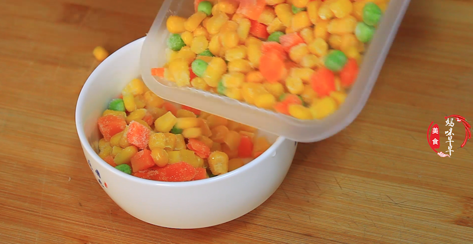 1,一些玉米粒,胡蘿蔔丁和青豆,我是在超市買的這種冷凍現成的,用起來比較方便。