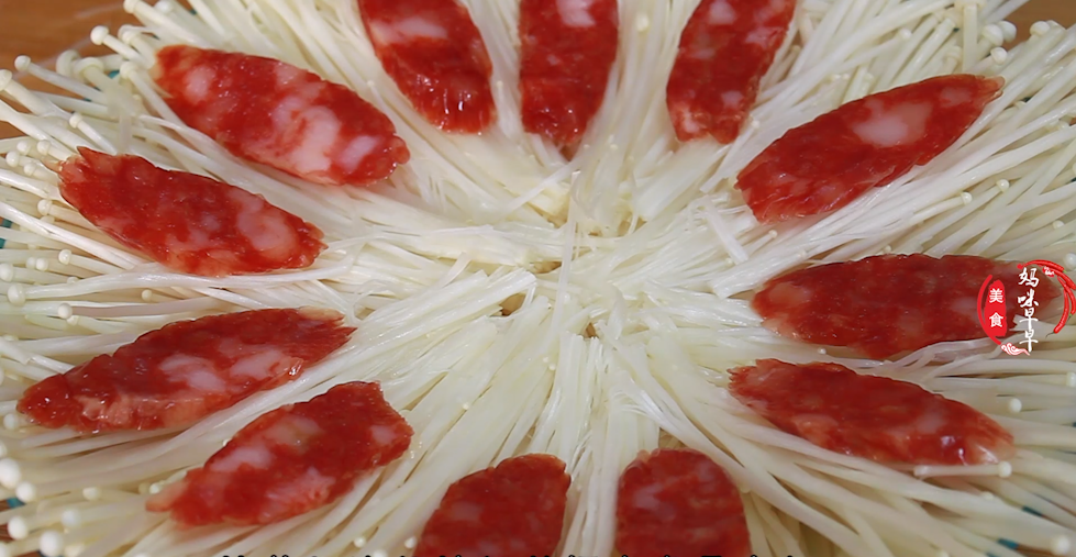 4,找一個大點的盤子,把金針菇根部朝裡擺入盤中,接著把切好的香腸片擺在金針菇上面,擺好的造型看著特別漂亮
