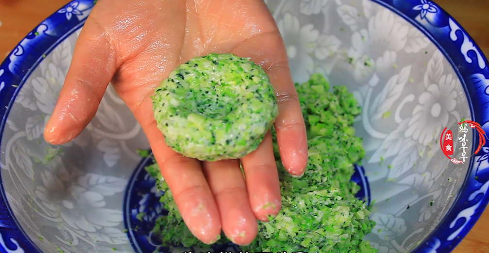 4、手上抹點油,取適量的西藍花然後先搓成圓球,然後用手指在中間選上一個窩,這個窩要稍微大一些,像這樣就可以了。