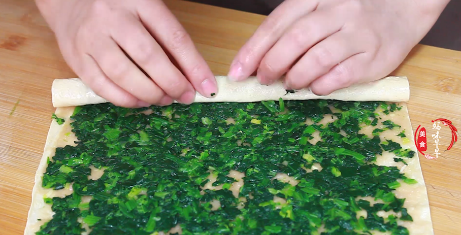 4,菠菜過涼之後擠幹水分,然後將它切成碎末,泡好的豆皮鋪在案板上,然後放入適量雞肉泥,先用筷子給它均勻地攤開,然後用勺子塗抹平整,勺子底部蘸點水,這樣不會粘。