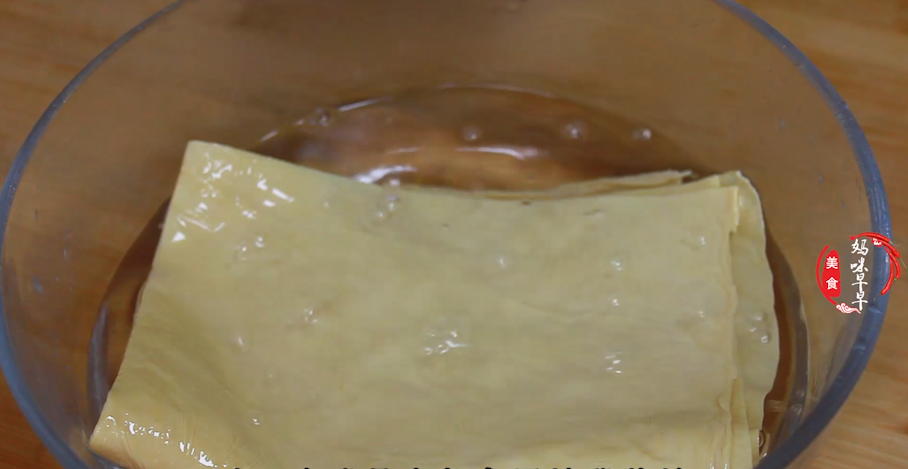 1,首先準備2張油豆皮用清水浸泡一會兒,油豆皮我是在超市買的袋裝的,這種形狀比較規則好操作。